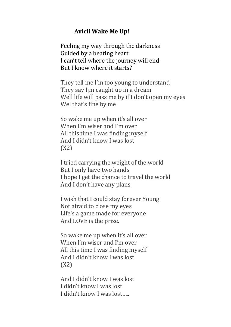 . Avicii Wake Me Up lyrics. Adobe After Effects 6 for animation render time 2h Sony Vegas Pro - for final renderI do NOT own this song. Wake Me Up on YouTube. Inloggen Registreer Nederlands Engels.But I know where to start They tell me Im too young to understand They say Im caught up in a dream Well life will pass me by if I dont open up my eyes Well thats fine by me So wake me up when its all over. AVICII - Wake Me Up Acoustic Version - Lyrics Tribute To AviciiCover byKURT SCHNEIDER. Feeling my way through the darkness Guided by a beating heart I can. Well thats fine by me.